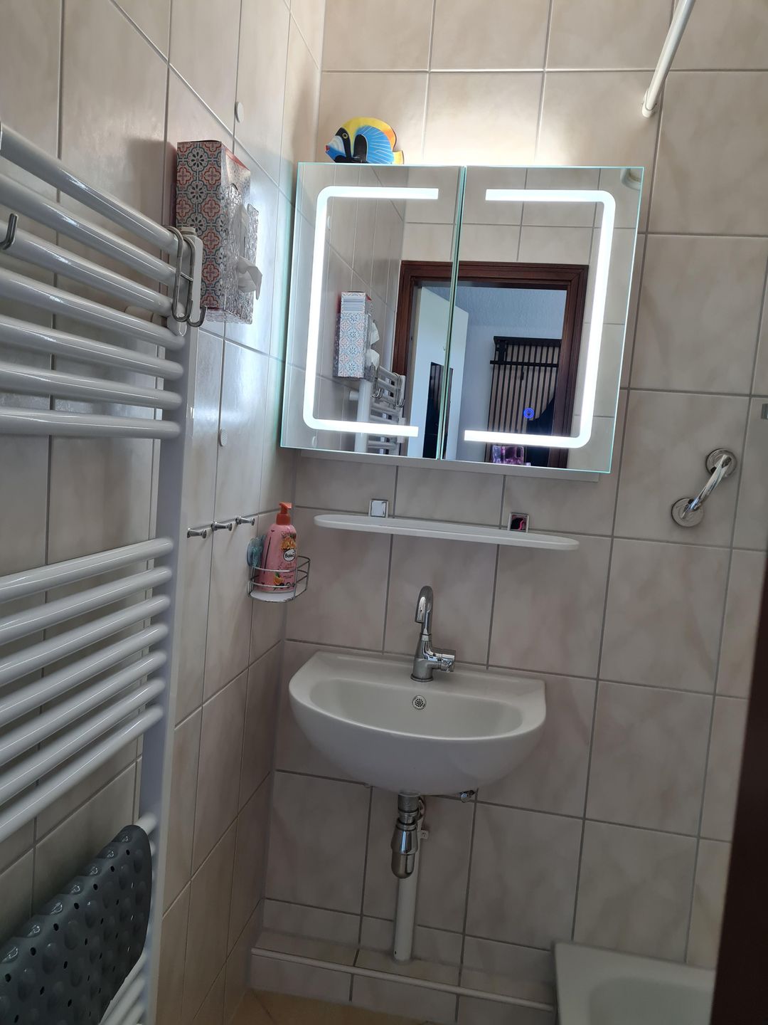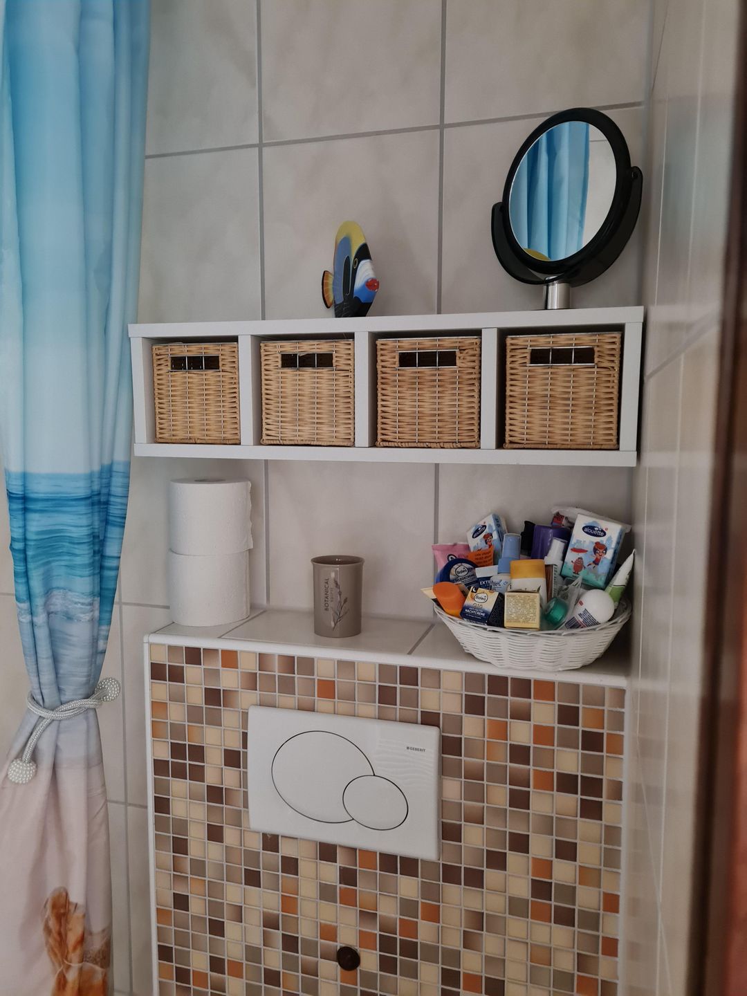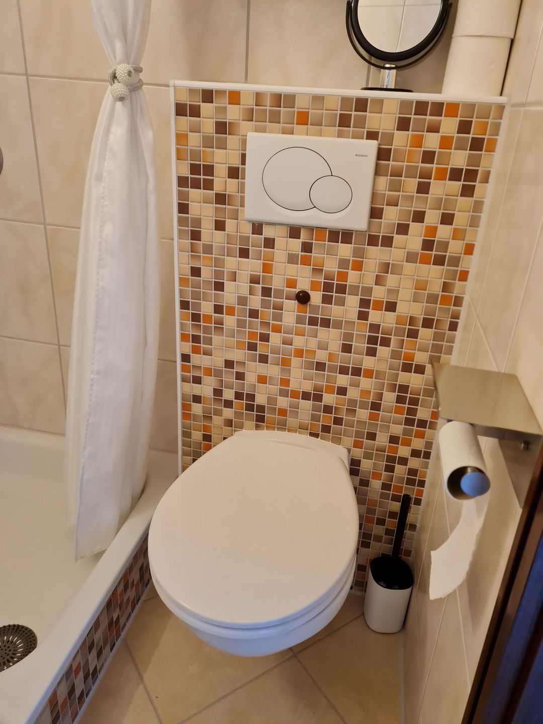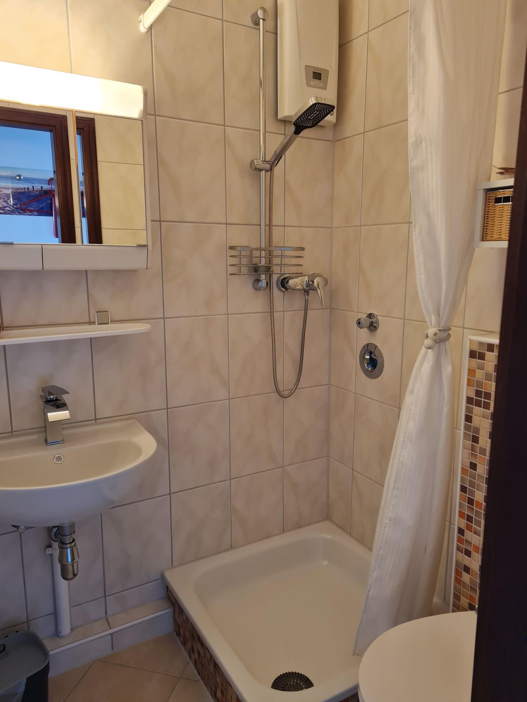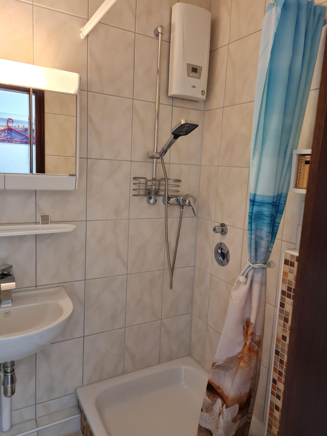 Das helle Badezimmer bietet eine Dusche mit Wanne und diverse Ablagemöglichkeiten. Für die Pflege Ihrer Garderobe stehen eine Waschmaschine und ein Trockner zur gemeinschaftlichen Nutzung bereit. Die Unterkunft ist durchgehend mit kostenfreiem WLAN und Internetzugang ausgestattet, sodass Sie auch unterwegs jederzeit online bleiben können.